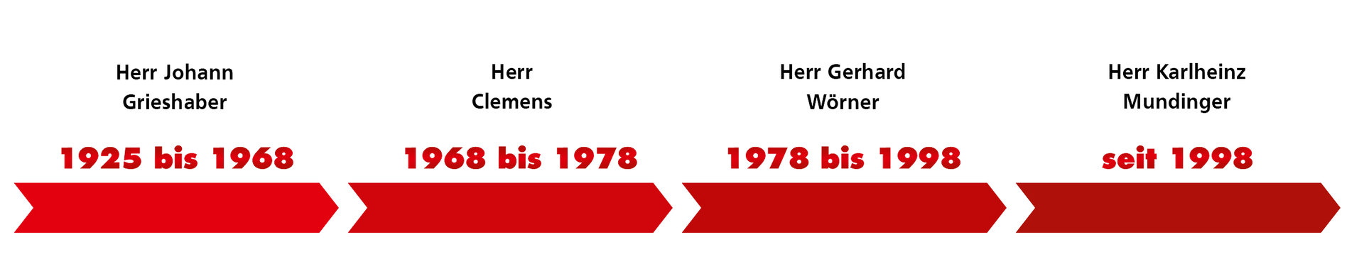 1925 wurde das Unternehmen von Herr Johann Grießhaber gegründet, er leitete das Unternehmen 43 Jahre. Von 1968 bis 1978 war Herr Clemens der 2. Inhaber. Herr Gerhard Wörner hat das Zepter für 20 Jahre als 3. von 1978 bis 1998 in der Hand. Als 4. im Bunde kann heute Herr Karlheinz Mundinger sein 25. Betriebsjubiläum feiern.